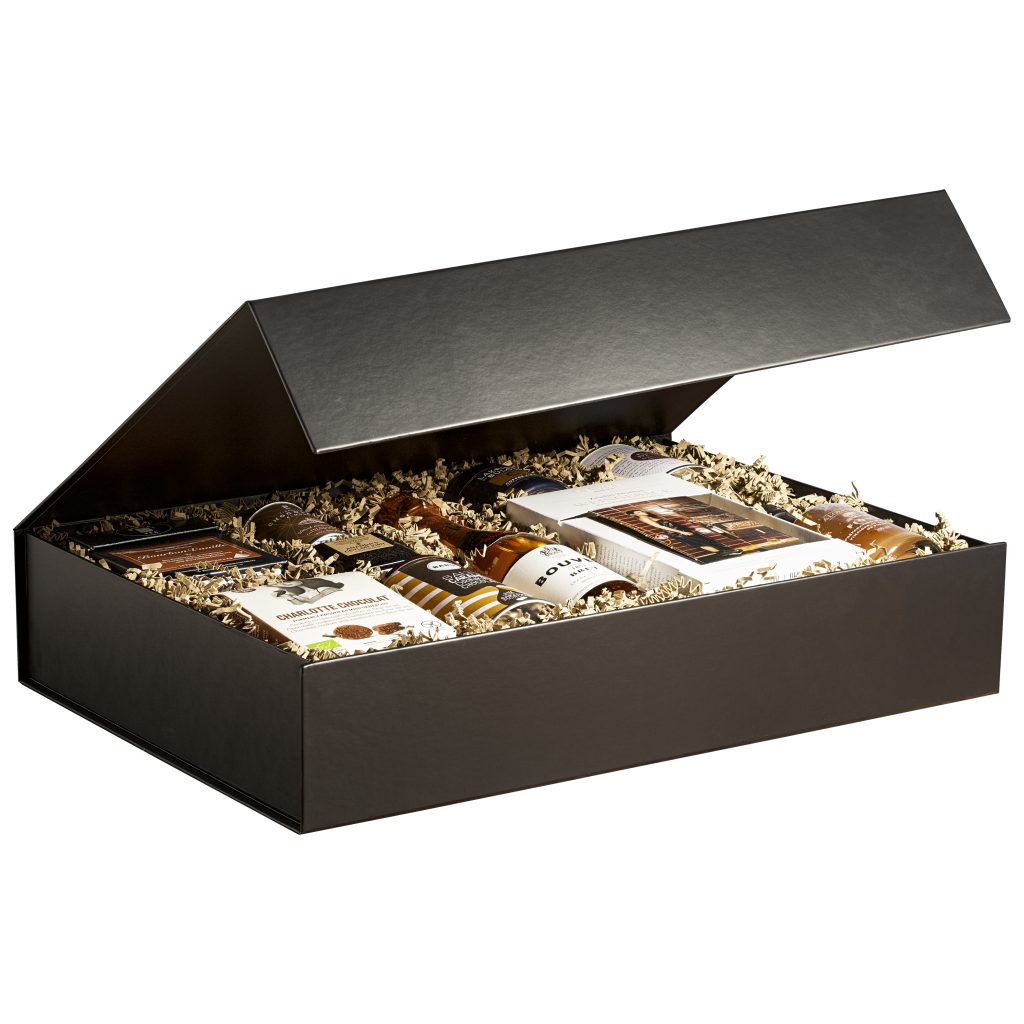 Edle Geschenkboxen mattschwarz veredelt und mit handverlesenen Delikatessen befüllt – Präsente mit Wow-Effekt!